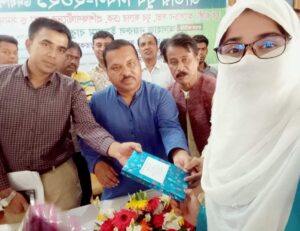 যুব দিবসের রচনা প্রতিযোগিতায় ১ম স্থান অর্জনকারী সুমাইয়া পুরস্কার গ্রহণ করছে মাননীয় এমপি মহোদয়ের নিকট থেকে।
